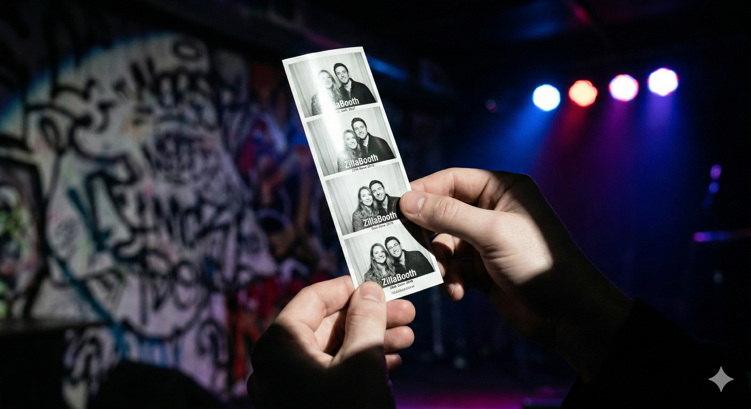Nostalgia, particularly for the late ’90s and early 2000s, is the aesthetic fuel. Photo booths, disposable cameras, and point-and-shoot digital cameras defined an era of spontaneous, low-fidelity photography. The vertical ZillaBooth photo strip, with its four iconic frames, instantly evokes that sense of carefree, low-stakes fun. By holding that strip up against the venue background…the very place it was taken…you are collapsing time, bringing the energy of the moment out of the past and into the now. You’re giving your digital followers a tangible, haptic reference point.
